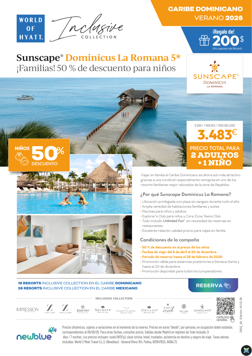 50% Dto para Niños hasta el 28/02. Sunscape Dominicus La Romana - Playa Sin Sargazo 3.483€ 2 adultos+1 Niño