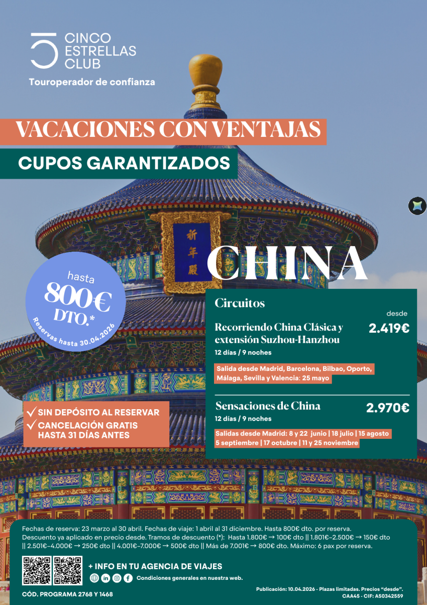 Hsta 800€dto.resrvas30.04 Cupos|China Clásica + Senasaciones de China dsd 2.419€ sal. May-Nov. varias ciudades
